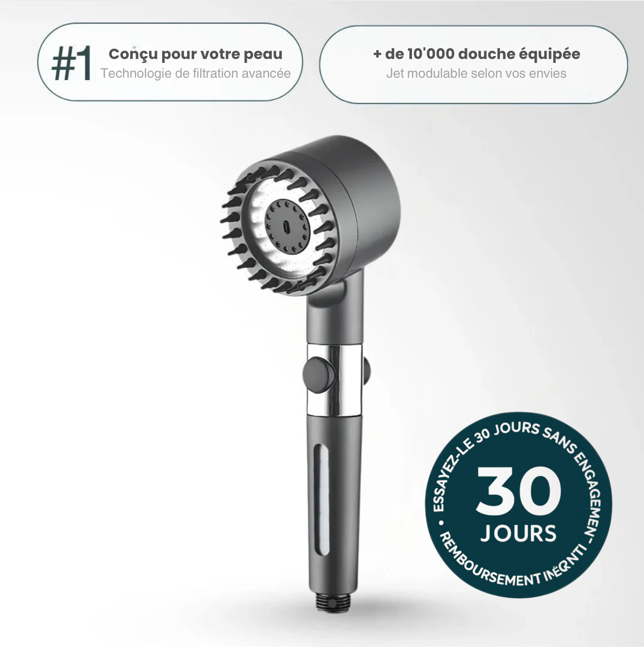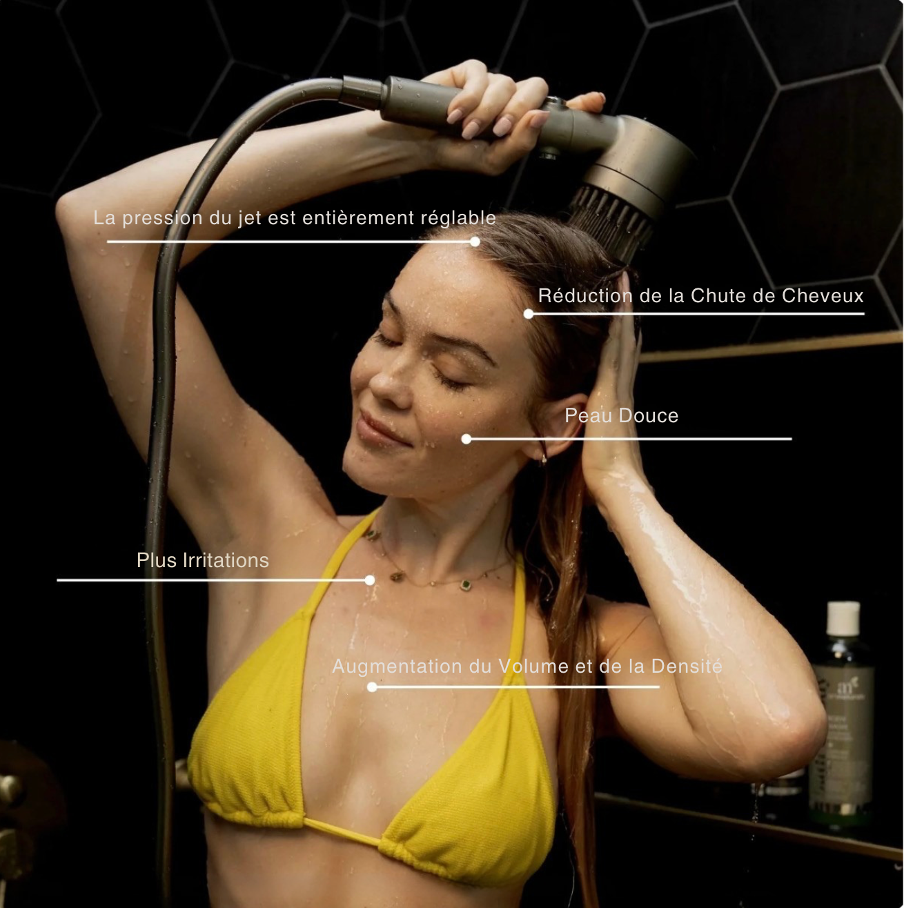 En Suisse, 75 % de l'eau du robinet contient du chlore et du calcaire qui s'accumulent sur la peau et les cheveux, les exposant à des dommages quotidiens tels que des cheveux abîmés et la peau sèche.