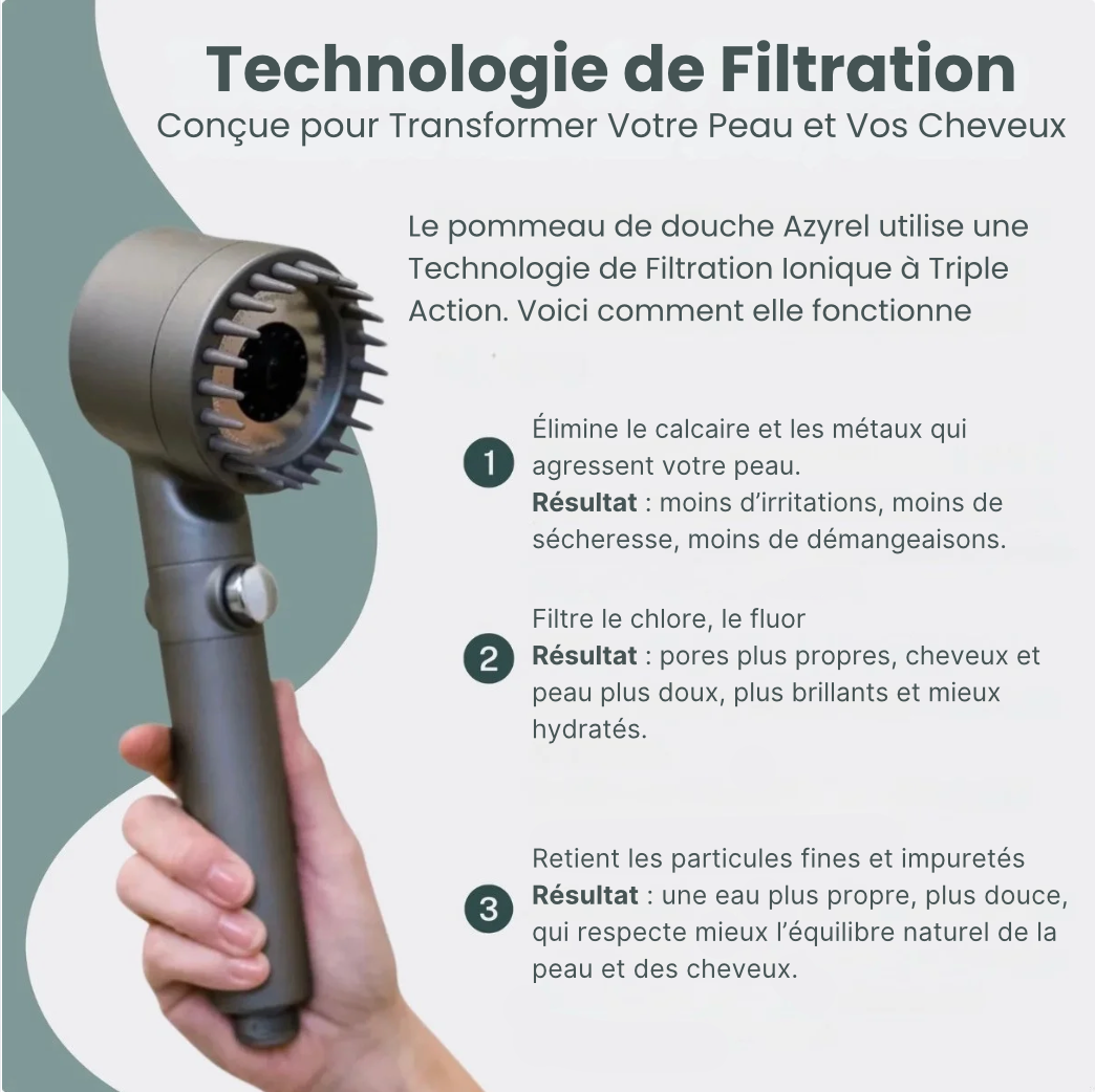 Azyrel utilise un système de filtration en 3 étapes capable d’éliminer le calcaire, le chlore les oxydes, les microplastiques et d’autres impuretés présentes dans l’eau.